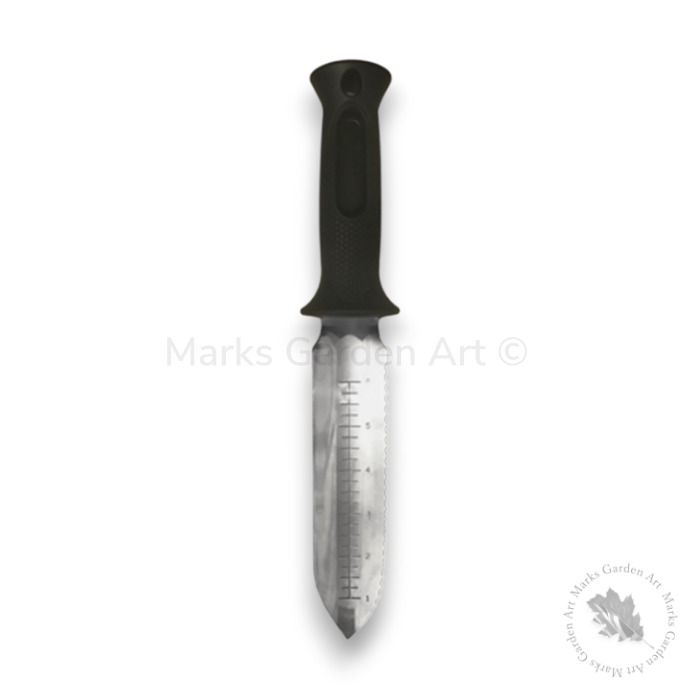 深さが測れる目盛付きのスコップ部には鋸歯状のギザギザがついており、しつこい根っこやツタを切ることもできるため、山菜取りナイフとしても利用できます。