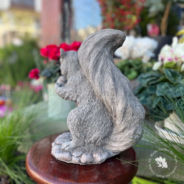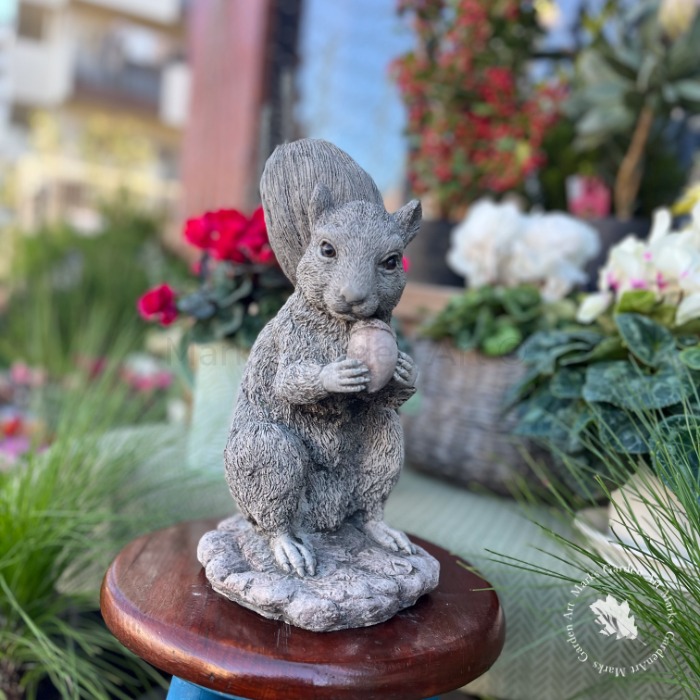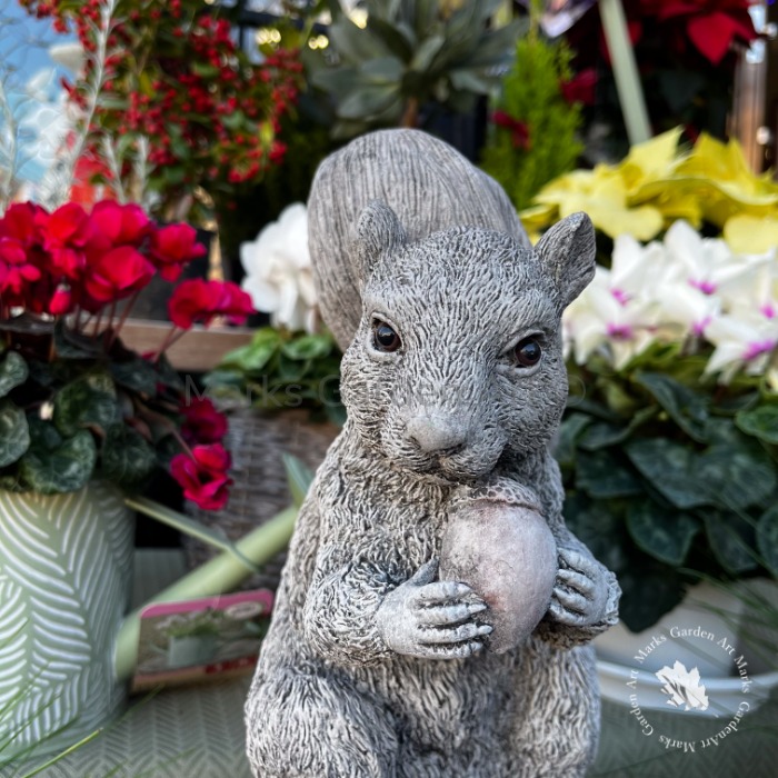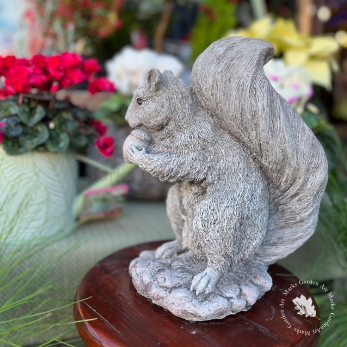 頬っぺたを膨らませてどんぐりをほおばるリスのガーデンオーナメント。ふさふさしたしっぽの毛並みまでしっかり再現されています。