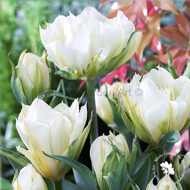 白色に緑の縁が入り、次第に薄い黄色へと変化する八重咲き