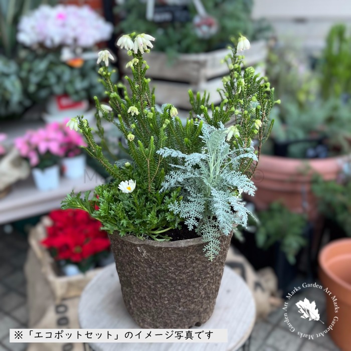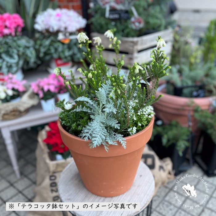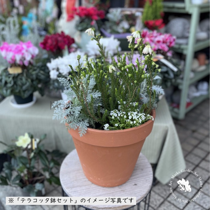 そんなお悩みに応えるべく、一度テラコッタ製の鉢付きセットをお買い上げいただくと、その後は中身をすっぽり入れ替えるだけで簡単に寄せ植えを一新できる便利な寄せ植えを販売いたします!