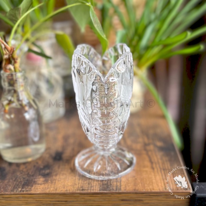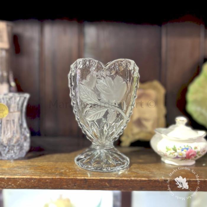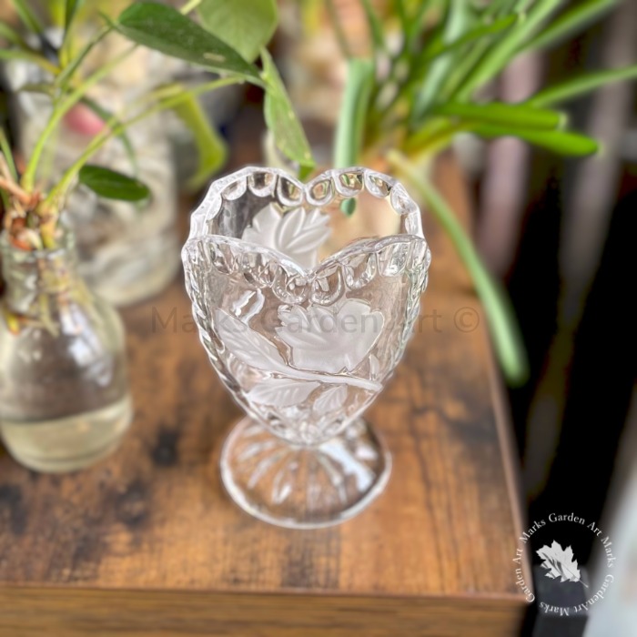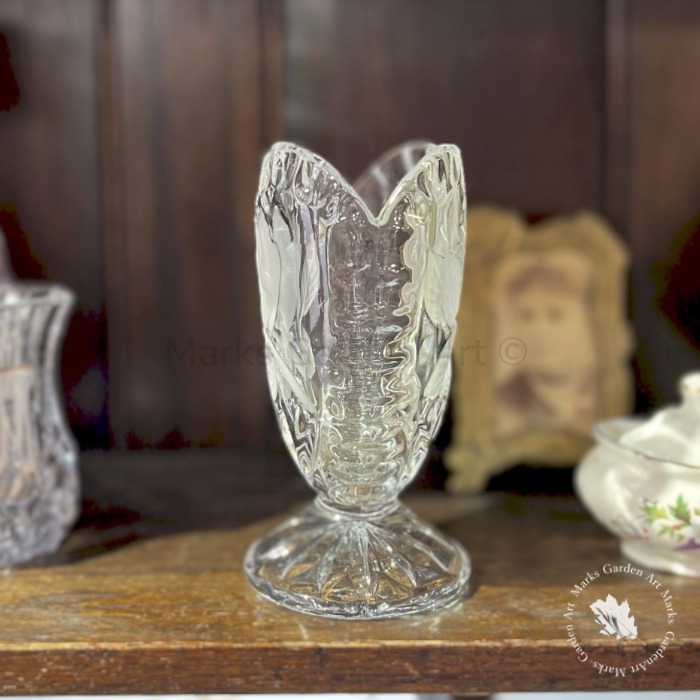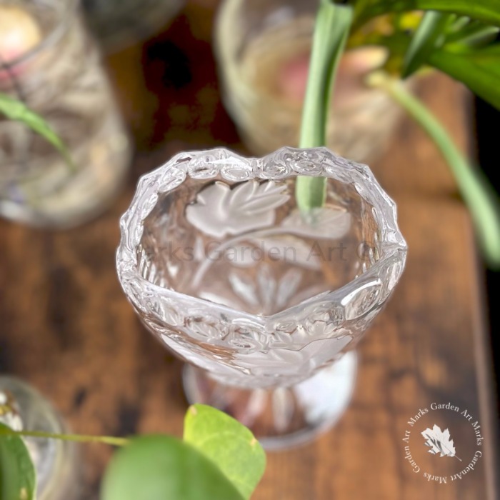 透明感のある厚手のガラスに、バラ模様のレリーフがほどよく光を受け、置くだけで空間に柔らかな陰影が生まれます。小ぶりなブーケや一輪挿しにも使いやすいサイズ感で、窓辺やサイドボードに置くだけで英国らしいロマンティックな雰囲気に。